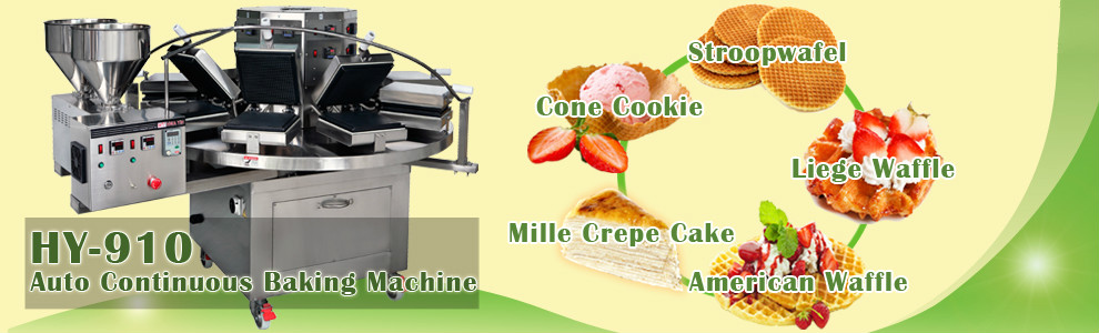 Automatic Suger Cone Making Machine for Sale TheJY25 automatic baking machine is used for rolling sugar cones.It offer cones to the next process to be filled with ice cream.First it dispenses batter on the baking plates to prepare the wafers for shaping,then rolls them up,keep them in shape unload them finally.It is the main device of the production line.Excellent performances have allowed International Standards to be comfortably met.