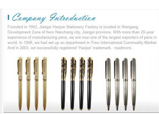Founded in 1992, Jiangxi Haojun Stationery Factory is located in WengangDevelopment Zone of Nanchang City, Jiangxi Province. With more than 20 years' experience in manufacturing pens, we are now one of the largest exporters of pens in the world. In 1998, we set up a department in Yiwu International Commodity Market. In 2003, we successfully registered 'Haojun' trademark.